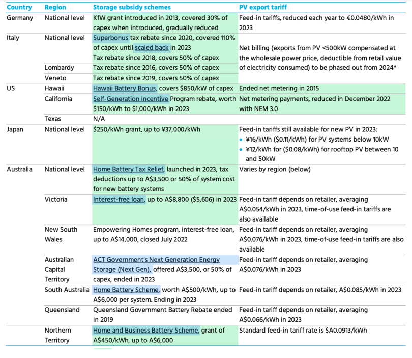 注:綠色=支持戶用儲能普及的主要驅(qū)動因素。*=意大利對新光伏系統(tǒng)的凈計費政策將于2024年1月1日終止,而現(xiàn)有系統(tǒng)需要在2024年年底前逐步轉(zhuǎn)為補(bǔ)償較低的計劃,補(bǔ)償金額約為100歐元/MWh,具體取決于生產(chǎn)時間和地區(qū)。日本的光伏輸出電價適用于10-50kW的光伏系統(tǒng)。