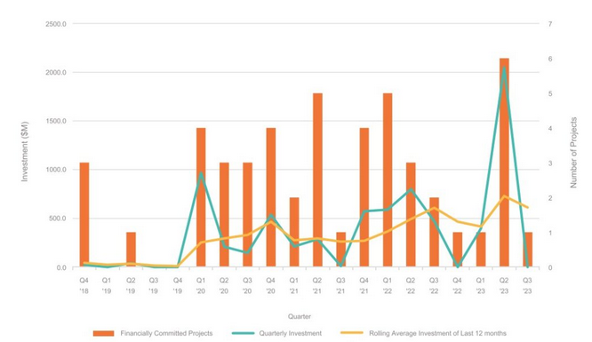 在今年第二季度,包括Waratah Super Battery電池儲(chǔ)能項(xiàng)目在內(nèi)的六個(gè)大型電池儲(chǔ)能系統(tǒng)獲得投資承諾,首次在一個(gè)季度內(nèi)突破10億澳元大關(guān)。而在今年第三季度,只有一個(gè)儲(chǔ)能項(xiàng)目獲得投資,是一個(gè)在采礦場(chǎng)部署的太陽(yáng)能+儲(chǔ)能混合項(xiàng)目。