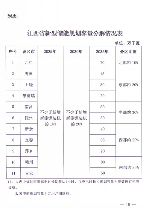 《發(fā)展規(guī)劃》制定了江西省分階段的儲能發(fā)展目標(biāo):到2025年、2030年,力爭實現(xiàn)各設(shè)區(qū)市新型儲能投產(chǎn)規(guī)模不少于新增新能源裝機(jī)的15%和20%。到2035年,力爭實現(xiàn)全省新型儲能投產(chǎn)600萬千瓦以上。