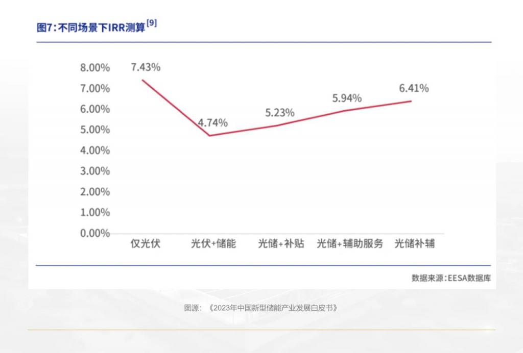 《2023 中國新型儲能行業(yè)發(fā)展白皮書》測算顯示:以內(nèi)蒙古某 100MW 光伏發(fā)電項(xiàng)目、配套 20MW/40MWh 儲能電站為例,其內(nèi)部收益率(IRR)在僅光伏發(fā)電的情景下,高達(dá) 7.43%;而配上儲能后,即便獲得政府補(bǔ)貼同時參與輔助服務(wù),IRR 也僅 6.41%。