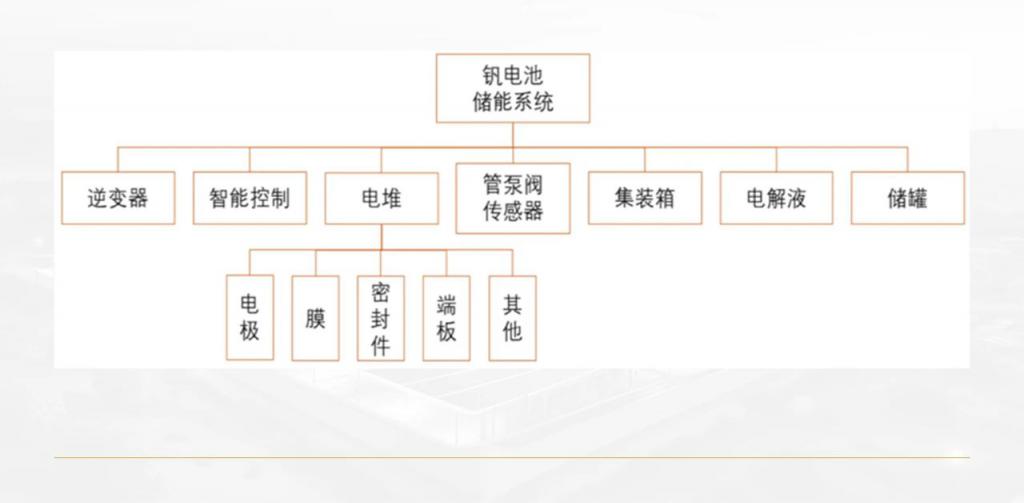 以釩液流電池為例,整個釩電池儲能系統(tǒng)主要由電堆、電解液、逆變器、智能控制、儲罐、集裝箱、管泵閥傳感器幾部分構(gòu)成。