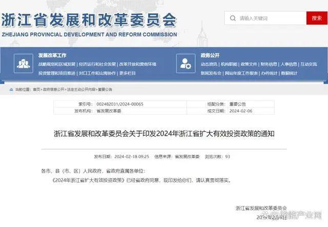 2月18日,浙江發(fā)改委官網(wǎng)發(fā)布關(guān)于印發(fā)2024年浙江省擴(kuò)大有效投資政策的通知。