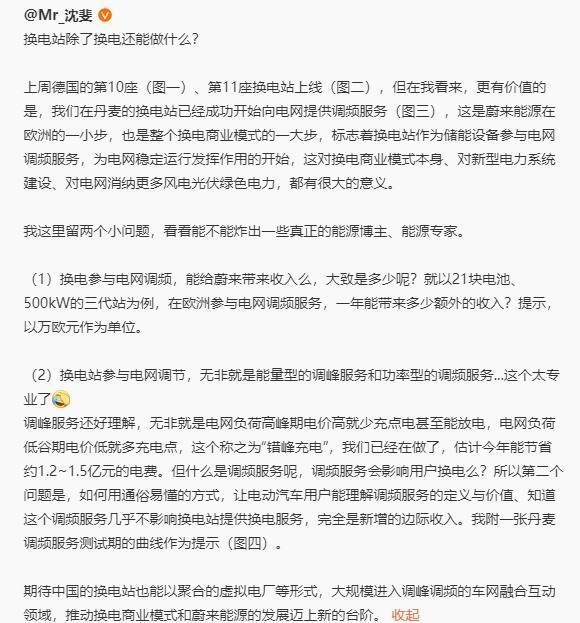 近日,智車派注意到,蔚來副總裁沈斐在微博發(fā)文稱,在丹麥的換電站已經成功開始向電網提供調頻服務,這是蔚來能源在歐洲的一小步,也是整個換電商業(yè)模式的一大步,標志著換電站作為儲能設備參與電網調頻服務。沈斐表示,期待中國的換電站也能以聚合的虛擬電廠等形式,大規(guī)模進入調峰調頻的車網融合互動領域。