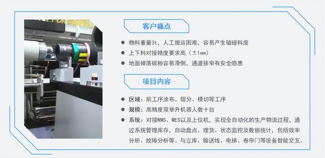 在某儲(chǔ)能頭部企業(yè)實(shí)現(xiàn)產(chǎn)線物流無人化的項(xiàng)目中,磅旗無人工場數(shù)字化方案籠罩前段與中段產(chǎn)線物流全過程,包含涂布上下料、極卷緩存搬運(yùn)、輥壓分切上料、輥壓分切下料、模切上下料、卷繞上料、隔閡運(yùn)輸、空卷筒回流運(yùn)輸?shù)裙に囘^程。實(shí)現(xiàn)全過程主動(dòng)化、無人化、物料多級智能拉動(dòng)、上下工序智能協(xié)同。