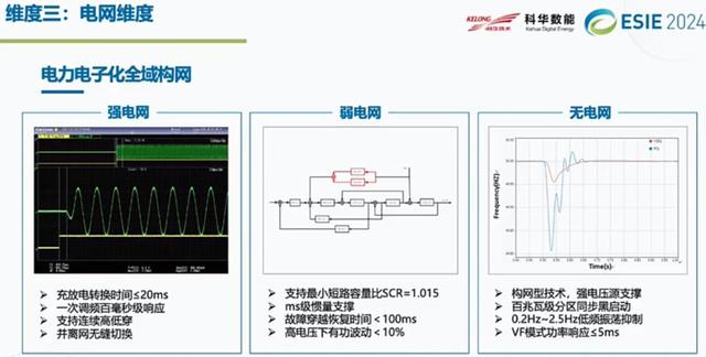 第三個創(chuàng)新維度就是電網(wǎng)側(cè)。現(xiàn)在的電力電子化,不管是光伏也好,儲能也好,對電網(wǎng)提出很大挑戰(zhàn)。當(dāng)前的一個構(gòu)網(wǎng),我們提出在強電網(wǎng)、弱電網(wǎng)甚至無電網(wǎng)的情況下面,新型儲能如何適應(yīng)電網(wǎng)的各種需求。