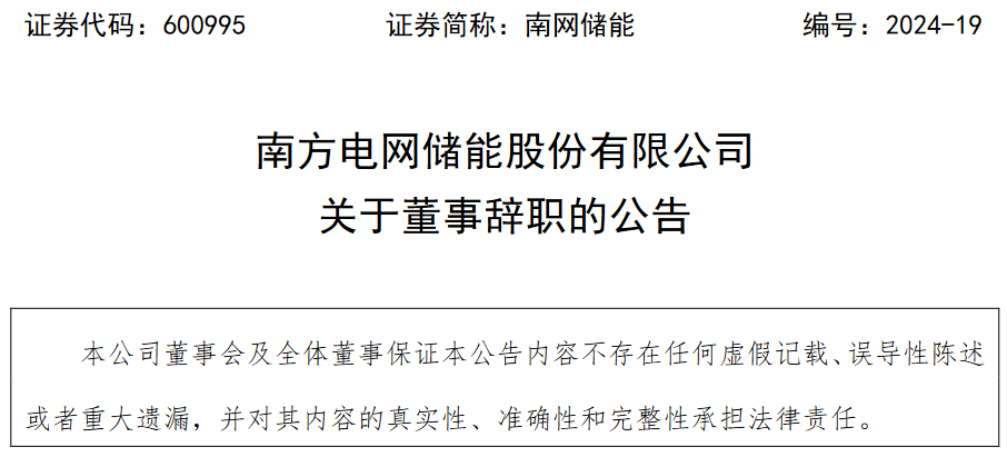 南網(wǎng)儲能于4月16日發(fā)布晚間公告稱,2024年4月16日,南方電網(wǎng)儲能股份有限公司(以下簡稱“公司”)董事會收到非獨立董事江裕熬先生遞交的書面辭職報告,江裕熬先生由于達到法定退休年齡,申請辭去公司董事及董事會科技創(chuàng)新委員會委員職務。