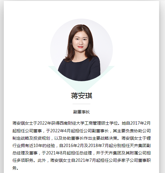 資料顯示,蔣安琪在鋰行業(yè)擁有近10年工作經(jīng)驗,自2016年2月、2018年7月起分別擔任天齊集團副總經(jīng)理、董事,并于2021年8月至2023年6月?lián)翁忑R集團總經(jīng)理,她同時在天齊集團及其附屬公司擔任多項職務(wù)。此外,蔣安琪自2021年7月起擔任天齊鋰業(yè)多家子公司董事職務(wù)。