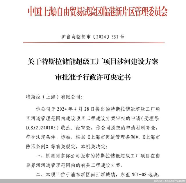 5月8日,上海臨港新片區(qū)管委會(huì)官網(wǎng)顯示,已公布關(guān)于與特斯拉儲(chǔ)能超級(jí)工廠項(xiàng)目涉河建設(shè)方案審批準(zhǔn)予行政許可決定書,同意特斯拉(上海)報(bào)審的特斯拉儲(chǔ)能超級(jí)工廠項(xiàng)目在南奉界河河道管理范圍內(nèi)的有關(guān)工程建設(shè)方案。