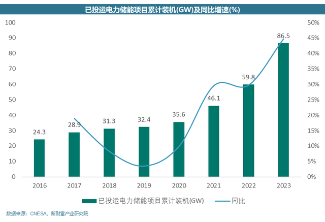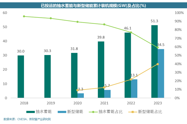 根據(jù)中國能源研究會(huì)儲(chǔ)能專委會(huì)及中關(guān)村儲(chǔ)能產(chǎn)業(yè)技術(shù)聯(lián)盟(CNESA)提供的數(shù)據(jù),到2023年底,抽水蓄能的累計(jì)裝機(jī)容量為51.3吉瓦,市場份額從2022年的77.1%降至59.4%。相比之下,新型儲(chǔ)能裝機(jī)量達(dá)到34.5吉瓦,容量為74.5吉瓦時(shí),同比增長達(dá)到163.36%,市場份額也從2022年的21.9%上升到39.9%。