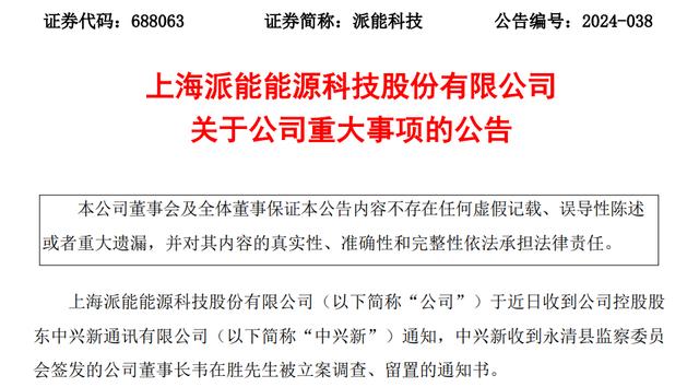 5月19日晚間,國內(nèi)知名企業(yè)儲能企業(yè)上海派能科技股份有限公司(以下簡稱“派能科技”)公告稱,公司近日收到其控股股東中興新通訊有限公司(下稱“中興新”)通知,中興新收到永清縣監(jiān)察委員會簽發(fā)的公司董事長韋在勝先生被立案調(diào)查、留置的通知書。