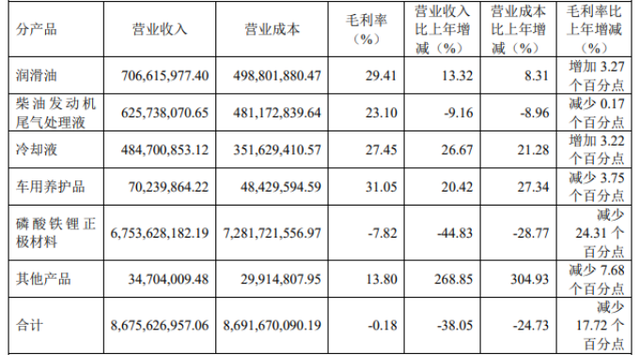 但有兩項業(yè)務(wù)收入同比下滑,其中柴油發(fā)動機(jī)尾氣處理液收入同比下降9.16%至6.26億元;磷酸鐵鋰正極材料產(chǎn)品實現(xiàn)營收67.54億元,同比下降44.83%??梢哉f收入占比達(dá)78%的磷酸鐵鋰正極材料極大地拉低了整體收入水平。