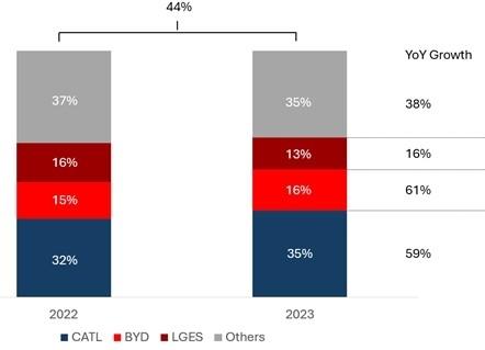 2023年全球電動汽車電池裝機(jī)容量同比增長44%,寧德時代和比亞迪作為中國電池制造商的代表,拿下了超過三分之二的市場份額,其中寧德時代是最大的受益者。