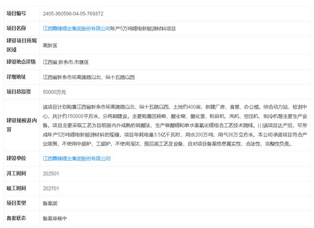 該項(xiàng)目編號(hào)為2405-360598-04-05-769372,項(xiàng)目名稱為“江西贛鋒鋰業(yè)集團(tuán)股份有限公司年產(chǎn)5萬噸鋰電新能源材料項(xiàng)目”。贛鋒鋰業(yè)作為建設(shè)單位,此次項(xiàng)目的開工時(shí)間定于2025年1月,預(yù)計(jì)竣工時(shí)間為2027年1月,項(xiàng)目類型為備案類,目前備案狀態(tài)為備案審核中。