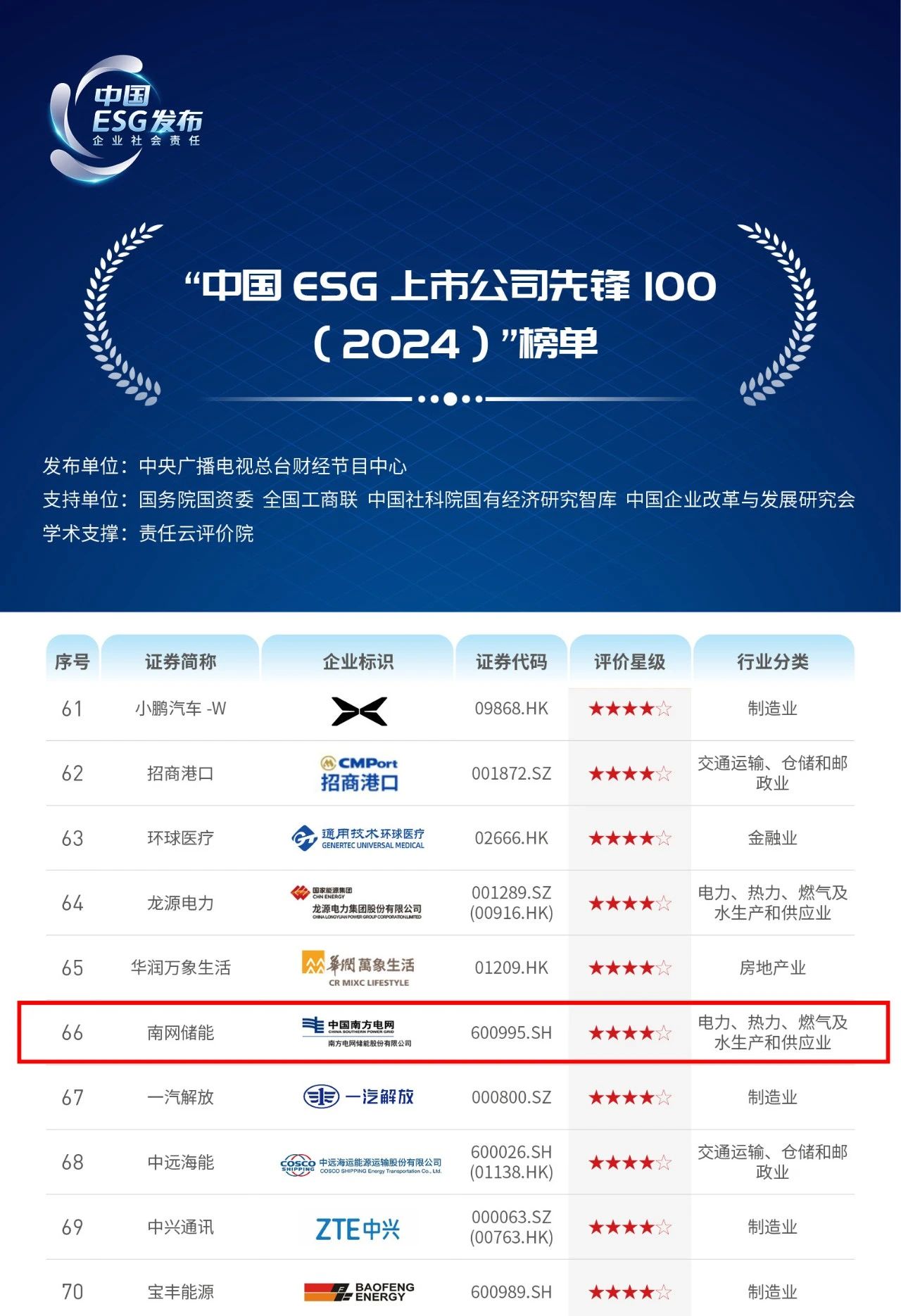 近日,中央廣播電視總臺財經(jīng)節(jié)目中心在北京正式發(fā)布《2024年度ESG行動報告》,入圍《報告》的100家“中國ESG上市公司先鋒100”企業(yè)中,南方電網(wǎng)儲能股份有限公司(以下簡稱“南網(wǎng)儲能”)憑借在環(huán)境、社會和公司治理等方面的履責(zé)成效,從6471家中國上市公司樣本池、972家上市公司評價樣本中脫穎而出,蟬聯(lián)該榜單,位列第66位,較去年排名提升26位。