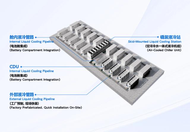 該系統(tǒng)由集中布置的液冷站、布置于電池艙內(nèi)的配水動力站(CDU) 、電池艙內(nèi)外液冷管路,以及TMS智控系統(tǒng)組成,其具有空冷冷水一體式液冷機(jī)組和均衡智控 TMS 兩項(xiàng)節(jié)能關(guān)鍵技術(shù):首先是集中式液冷機(jī)組相比分布式液冷機(jī)組全年能效比提高113%,全年節(jié)省能耗大于50%。其次是均衡智控TMS基于負(fù)荷實(shí)時(shí)預(yù)測、CPC均衡模型等,可精準(zhǔn)預(yù)測電池系統(tǒng)溫控目標(biāo)曲線,實(shí)現(xiàn)電芯均衡冷卻,可使液冷系統(tǒng)冷卻能力輸出峰值降低35%以上,帶來液冷站配置規(guī)??蓽p小35%或節(jié)能45%,相比于分布式電池艙液冷系統(tǒng)節(jié)能效果顯著,在儲能液冷、數(shù)據(jù)中心液冷等領(lǐng)域都具備良好的應(yīng)用前景。