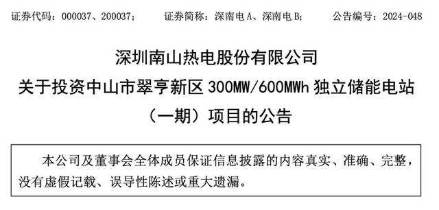 目的及影響方面,深南電A表示,投資中山市翠亨新區(qū)300MW/600MWh獨立儲能電站(一期)項目符合公司在新形勢下戰(zhàn)略發(fā)展的需求,有利于推動公司在大型儲能領域的探索與實踐,助力公司向綜合能源服務轉型;有利于公司充分利用現(xiàn)有資源,打造新型商業(yè)模式,推動公司全面轉型發(fā)展;有利于中山市深入貫徹落實“雙碳”政策,打造獨立儲能項目示范,協(xié)同儲能相關產業(yè)鏈;有利于盤活中山公司線路資產,促進國有資產的提質增效。在確保公司日常經營和資金安全的前提下,使用中山公司線路資產投資中山市翠亨新區(qū)300MW/600MWh獨立儲能電站(一期)項目不影響公司日常資金周轉需要,不影響公司生產經營的正常開展。中山市翠亨新區(qū)300MW/600MWh獨立儲能電站(一期)項目產業(yè)方向符合公司未來的戰(zhàn)略布局,將會對公司未來的財務狀況及長遠發(fā)展產生積極影響。
