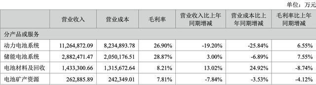 從目前寧德時代業(yè)務情況來看,其主營業(yè)務包括動力電池系統(tǒng)、儲能電池系統(tǒng)、電池材料及回收、電池礦產資源。今年上半年,寧德時代動力電池系統(tǒng)營收為1126億元,同比下滑19%,占總營收的比例為67%。值得注意的是,雖然寧德時代上半年動力電池系統(tǒng)營業(yè)成本同比下降25.84%,動力電池系統(tǒng)營收下降,但其動力電池系統(tǒng)毛利率同比增長6.55%至26.9%。