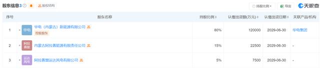 據(jù)信息顯示,內(nèi)蒙古華電阿拉善綠色能源有限公司的法定代表人是盧茂茂。該公司由華電(內(nèi)蒙古)新能源有限公司、內(nèi)蒙古阿拉善能源有限責(zé)任公司、以及阿拉善盟運(yùn)達(dá)風(fēng)電有限公司共同持有股份,其中中國(guó)華電旗下的華電(內(nèi)蒙古)新能源有限公司持有80%的股份。