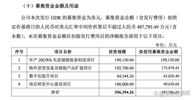 此次發(fā)行GDR的募集資金為美元,募集資金總額(含發(fā)行費(fèi)用)折算后不超過人民幣48.78億元。所募資金在扣除發(fā)行費(fèi)用后,將全部用于年產(chǎn)20GWh先進(jìn)儲能裝備制造項(xiàng)目、海外逆變設(shè)備及儲能產(chǎn)品擴(kuò)建項(xiàng)目、數(shù)字化提升項(xiàng)目以及南京研發(fā)中心建設(shè)項(xiàng)目。