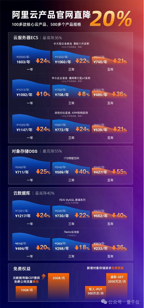 其中,云服務器ECS最高降36%,對象存儲OSS最高降55%,云數據庫RDS最高降40%。