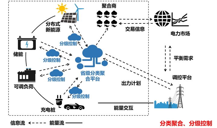 (十五)推動源網(wǎng)荷儲電力資源分類分級聚合?;诮y(tǒng)一的數(shù)字底座、物聯(lián)采集與實時量測中心等技術(shù)架構(gòu),建立和完善省級源網(wǎng)荷儲分類聚合平臺,通過統(tǒng)一平臺對源網(wǎng)荷儲四側(cè)資源分散聚合控制,實現(xiàn)電力系統(tǒng)分層分級的綜合動態(tài)平衡。開展源網(wǎng)荷儲分類分級聚合頂層設(shè)計,研究制定分類分級聚合的技術(shù)路徑和實施方案。推動分布式光伏運(yùn)營監(jiān)測平臺、配電監(jiān)控系統(tǒng)的升級改造和分級應(yīng)用,實現(xiàn)對分布式光伏的“剛性控”“柔性控”“群調(diào)群控”等多場景靈活控制。完善常規(guī)中小電源聚合平臺,調(diào)動中小電源深度聚合的積極性,提升中小電源統(tǒng)一調(diào)度能力,實現(xiàn)廣域協(xié)同、靈活互動。深化建設(shè)新型負(fù)荷管理平臺,提升新型負(fù)荷管理系統(tǒng)智能化、實用化水平,對負(fù)荷資源分層分類統(tǒng)一管理、統(tǒng)一調(diào)控、統(tǒng)一服務(wù)。建設(shè)用戶側(cè)儲能監(jiān)控平臺,分級分類接入用戶側(cè)儲能電站數(shù)據(jù),實現(xiàn)海量用戶側(cè)儲能資源更大范圍的共享互濟(jì)和優(yōu)化配置。建立適應(yīng)源網(wǎng)荷儲分類分級聚合的調(diào)度模式和交易機(jī)制,貫穿省、市、縣三級調(diào)度系統(tǒng),制定并網(wǎng)管理、運(yùn)行控制相關(guān)標(biāo)準(zhǔn)規(guī)范,完善清潔能源、需求側(cè)資源和儲能參與電力市場的機(jī)制,依托統(tǒng)一的信息共享和技術(shù)支持平臺,培育多類型聚合商參與分層分級聚合調(diào)度。構(gòu)建基于電網(wǎng)一張圖的新型電力系統(tǒng)全要素數(shù)字底座,開展新型電力系統(tǒng)各要素承載力的可視化推演計算,實現(xiàn)配網(wǎng)各環(huán)節(jié)、各業(yè)務(wù)以及新要素的全面圖上管控,提升分布式資源消納能力。