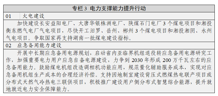 (八)提升電力應(yīng)急備用能力。加強(qiáng)極端形勢下電力風(fēng)險管控,做好應(yīng)對自然災(zāi)害、尖峰負(fù)荷、大面積停電、電網(wǎng)攻擊等情況的保供預(yù)案,提高應(yīng)急處置和抗災(zāi)能力。開展中長期應(yīng)急備用電源規(guī)劃,按照最大負(fù)荷3%—4%疊加新能源裝機(jī)容量1%—3%標(biāo)準(zhǔn)配置應(yīng)急備用電源規(guī)模。落實國家應(yīng)急備用電源管理要求,科學(xué)認(rèn)定和退出應(yīng)急備用機(jī)組,對符合能效、環(huán)保、安全等政策和標(biāo)準(zhǔn)要求的退役火電機(jī)組,按照“關(guān)而不拆”原則轉(zhuǎn)為應(yīng)急備用電源,做好設(shè)備維護(hù)和燃料供應(yīng)保障。支持分布式天然氣發(fā)電項目建設(shè),在有規(guī)模熱(冷)負(fù)荷的工業(yè)園區(qū)、經(jīng)濟(jì)開發(fā)區(qū)、空港新區(qū)等區(qū)域,因地制宜建設(shè)背壓式燃煤熱電聯(lián)產(chǎn)項目或分布式天然氣冷熱電三聯(lián)供項目,積極推廣建設(shè)用戶側(cè)分布式智慧綜合能源,提升就地就近電力安全保障能力。加強(qiáng)政府、醫(yī)院、鐵路、民航等重要電力用戶應(yīng)急自備電源建設(shè),力爭實現(xiàn)應(yīng)配盡配全面覆蓋,電源容量應(yīng)滿足全部保安負(fù)荷需求。加強(qiáng)抽水蓄能電站應(yīng)急備用能力建設(shè),推動抽水蓄能電站具備黑啟動功能。做好一次能源監(jiān)測預(yù)警和供應(yīng)協(xié)調(diào),提升電源發(fā)電能力,利用負(fù)荷和電源的時空互補(bǔ)特性,有效提高湖南與其他區(qū)域間電力互補(bǔ)互濟(jì)、調(diào)劑余缺能力。