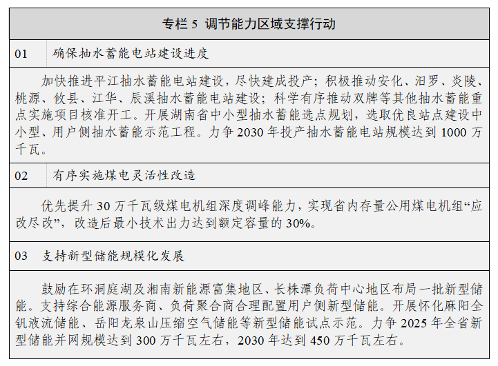 (十六)大力推進(jìn)抽水蓄能電站建設(shè)。統(tǒng)籌考慮電力系統(tǒng)需求、站點資源、生態(tài)環(huán)境、省間和區(qū)域內(nèi)優(yōu)化配置等因素,合理布局、科學(xué)有序開發(fā)建設(shè)抽水蓄能電站,打造中南地區(qū)抽水蓄能基地,依托交直流混聯(lián)電網(wǎng)配置平臺和全國統(tǒng)一電力市場,推動全省電力調(diào)節(jié)能力為跨省區(qū)輸電通道及區(qū)域電網(wǎng)安全穩(wěn)定運(yùn)行提供穩(wěn)定支撐。加快推進(jìn)在建和已核準(zhǔn)抽水蓄能項目建設(shè),積極推進(jìn)其他重點實施抽水蓄能項目前期工作,按照“框定總量、提高質(zhì)量、優(yōu)中選優(yōu)、有進(jìn)有出、動態(tài)調(diào)整”的原則,及時對中長期抽水蓄能規(guī)劃進(jìn)行滾動調(diào)整,實現(xiàn)新能源與抽水蓄能一體化發(fā)展。積極開展抽水蓄能建設(shè)模式創(chuàng)新與多場景應(yīng)用,在新能源資源富集區(qū)、負(fù)荷中心進(jìn)行中小型、用戶側(cè)抽水蓄能選點和關(guān)鍵技術(shù)攻關(guān),選取優(yōu)良站點建設(shè)示范工程。探索利用中小型分布式抽水蓄能電站提高新能源就近消納水平。支持常規(guī)水電站梯級融合改造增建混合式抽水蓄能、小水電蓄能化改造等開發(fā)模式,建設(shè)小水電蓄能化試驗平臺。至2030年,全省抽水蓄能電站總裝機(jī)容量力爭達(dá)到1000萬千瓦以上。