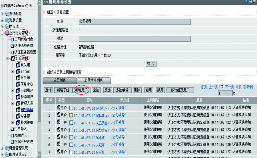 內(nèi)網(wǎng)管理一般通過路由模式或橋接模式將硬件連接到網(wǎng)絡(luò)出口,并通過內(nèi)網(wǎng)管理系統(tǒng)進(jìn)行網(wǎng)絡(luò)監(jiān)控。首先要通過內(nèi)網(wǎng)管理系統(tǒng)將上網(wǎng)賬戶規(guī)劃到不同的組織結(jié)構(gòu),針對不同組織結(jié)構(gòu)進(jìn)行策略配置。如圖1、圖2、圖3所示。