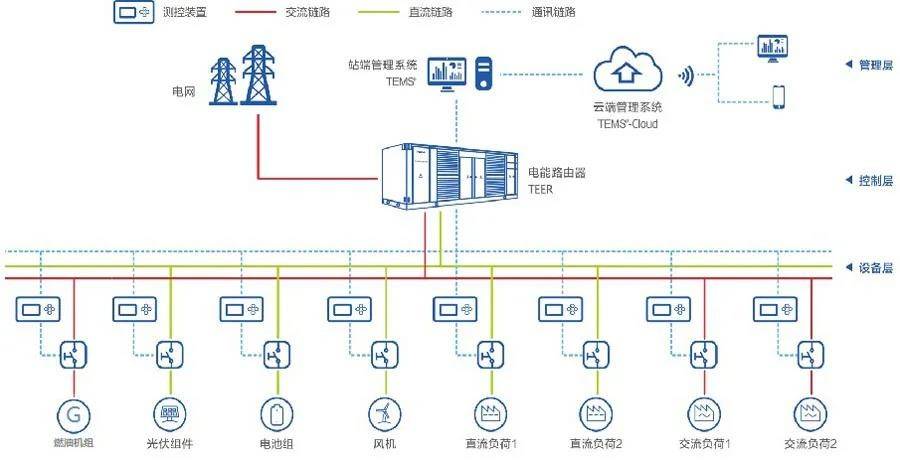 基于電力電子變壓器的交直流混合微網(wǎng)系統(tǒng)總體可分為三層架構(gòu)。第一層為設(shè)備層,主要囊括了分布式電源(風(fēng)電、光伏系統(tǒng)等)和不同的交直流負(fù)荷;第二層控制層,以電力電子變壓器為核心,分布式電源和負(fù)荷可通過其靈活的多端口配置實(shí)現(xiàn)可靠接入,并通過其中/高壓接口,實(shí)現(xiàn)與配電網(wǎng)的有效連接;第三層為管理層,以“雙端”能量管理系統(tǒng)為核心,采用人工智能算法可實(shí)現(xiàn)電力電子變壓器交直流混合系統(tǒng)的分布式能源互補(bǔ)優(yōu)化以及多個端口之間的協(xié)調(diào)控制,提高能源利用效率,多機(jī)并聯(lián)系統(tǒng)的集群控制、功率在線優(yōu)化分配,保障系統(tǒng)效率最優(yōu),同時能夠?qū)与娋W(wǎng)調(diào)度,參與電力市場交易及輔助服務(wù)等,真正實(shí)現(xiàn)綠色數(shù)據(jù)中心電能的智能路由。
