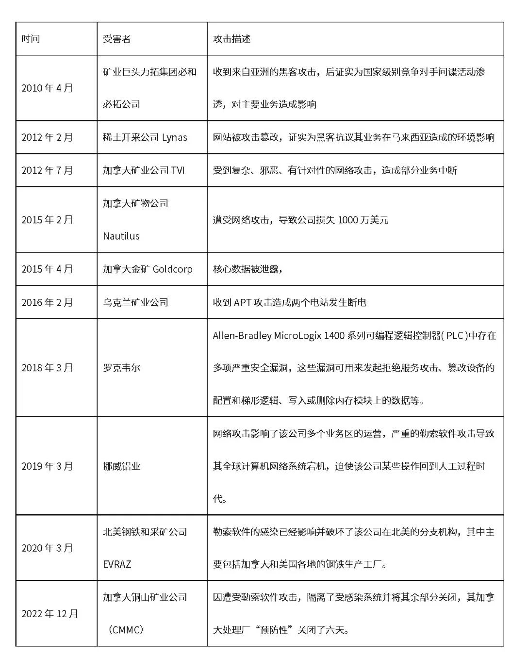 但隨著原有封閉的礦山工業(yè)控制系統(tǒng)與開放的信息化系統(tǒng)融合,也帶來了大量的網(wǎng)絡(luò)安全威脅。而大型礦山企業(yè)工業(yè)網(wǎng)絡(luò)復雜,存在較多的管理薄弱環(huán)節(jié),更容易受到來自外部的惡意攻擊或內(nèi)部操作失誤所引起的網(wǎng)絡(luò)異常,由此造成停產(chǎn)和監(jiān)管部門處罰將會給企業(yè)造成大量損失。從國際上來看,有下列較為嚴重的網(wǎng)絡(luò)攻擊案例: