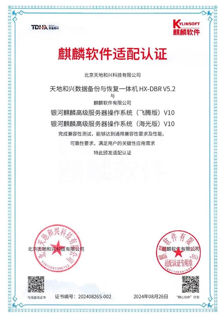 經(jīng)過嚴(yán)格測試與深度合作,天地和興與麒麟軟件順利完成了產(chǎn)品兼容性認(rèn)證。測試結(jié)果表明,天地和興的數(shù)據(jù)備份與恢復(fù)一體機(jī)在麒麟軟件銀河麒麟高級(jí)服務(wù)器操作系統(tǒng)V10上運(yùn)行穩(wěn)定,表現(xiàn)出色,充分滿足了用戶在性能和可靠性方面的需求。