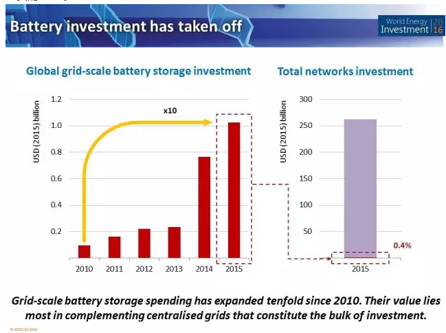 電力儲(chǔ)能投資2015年超過(guò)100億美元,過(guò)去十年以10%的系數(shù)在增長(zhǎng);但是儲(chǔ)能投資僅占電網(wǎng)投資的0.4%。