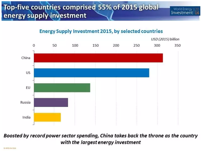 LaszloVARRO介紹,在2015年中國(guó)成為全球最大的能源投資國(guó),中國(guó)能源領(lǐng)域總投資為3150億美元,占全球能源總投資的17%。主要原因是積極推進(jìn)低碳能源、智能電網(wǎng)、能效提升等政策。