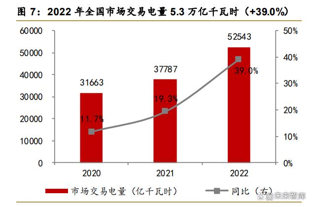 全國市場化交易電量占全社會用電量的比重逐年上升。新一輪電改實(shí)施以來,我國電力 市場建設(shè)穩(wěn)步有序推進(jìn),價格機(jī)制也愈加完善,市場化交易電量占全社會用電量的比重大幅 提升。2022 年全國市場交易電量約 5.3 萬億千瓦時,同比高增 39.0%,占全社會用電量比 重為 60.8%,較 2021 年提升 15.3pp。據(jù)中電聯(lián)《中國電力行業(yè)年度發(fā)展報(bào)告 2022》顯示, 截至 2021 年底,全國各電力交易中心累計(jì)注冊市場主體 46.7 萬家,數(shù)量較 2020 年增長 76.0%。電力市場化建設(shè)具備先進(jìn)性,一方面,市場化價格有利于充分反映電力市場真實(shí)供 需變化,煤價上漲等成本壓力通過更高電價傳導(dǎo)到下游的機(jī)制更順暢;另一方面,電力市場 化交易有利于實(shí)現(xiàn)電力資源在全國范圍內(nèi)的優(yōu)化配置,更好實(shí)現(xiàn)跨省跨區(qū)電力傳送。