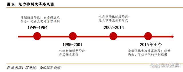 從我國電價政策機(jī)制發(fā)展歷程來看,我國電價政策機(jī)制發(fā)展歷程大致可以分成四個階段: 1)計(jì)劃經(jīng)濟(jì)階段(1949-1984 年):1950 年,我國成立電力行業(yè)管理局,初步形成以中央 領(lǐng)導(dǎo)為主、地方領(lǐng)導(dǎo)為補(bǔ)充的政企合一的垂直電力管理體制;2)電價初始調(diào)整階段 (1985-2001 年):1985 年,以國家經(jīng)濟(jì)委員會、國家計(jì)劃委員會、水利電力部、國家物價 局發(fā)布的《關(guān)于鼓勵集資辦電和實(shí)行多種電價的暫行規(guī)定》為標(biāo)志,開啟分類定價;3)電力 市場化過渡階段(2002-2014 年):2002 年國務(wù)院發(fā)布《電力體制改革方案》,標(biāo)志著我國 電力行業(yè)定價正式告別政府定價,進(jìn)入市場競價新時代。4)全面深化電力改革階段(2015 年至今):2015 年,中共中央國務(wù)院下發(fā)《關(guān)于進(jìn)一步深化電力體制改革的若干意見》(中發(fā) [2015]9 號),確定了“三放開、一獨(dú)立、三強(qiáng)化"的改革基本路徑以及"放開兩頭、管住中間" 的體制框架。 新一輪電力體制改革加速推進(jìn)。傳統(tǒng)電力系統(tǒng)調(diào)度模式為“源隨荷動”,根據(jù)用電側(cè)來 調(diào)整電源側(cè)的發(fā)電量,新型電力系統(tǒng)下電源側(cè)發(fā)電量和負(fù)荷側(cè)用電量均不可控,加大了電力 調(diào)度難度。而目前電網(wǎng)調(diào)度方式主要是面向常規(guī)電源為主的計(jì)劃調(diào)度機(jī)制,電力體制改革隨 之深化。