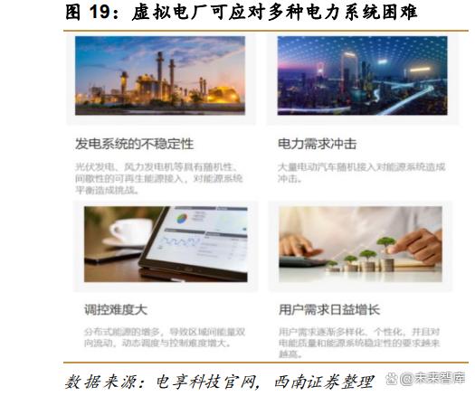 虛擬電廠具有需求側(cè)響應(yīng)、多負(fù)荷管理等多種功能,可應(yīng)對(duì)發(fā)電系統(tǒng)多樣化困難。虛擬 電廠可以應(yīng)對(duì)發(fā)電系統(tǒng)不穩(wěn)定性(風(fēng)光隨機(jī)性和間歇性對(duì)能源系統(tǒng)平衡造成挑戰(zhàn))、電力需 求沖擊(大量電動(dòng)汽車隨機(jī)接入,對(duì)能源系統(tǒng)造成沖擊)、調(diào)控難度大(分布式能源增多, 導(dǎo)致動(dòng)態(tài)調(diào)度與控制難度提升)和用戶需求日益提升等多種困難。