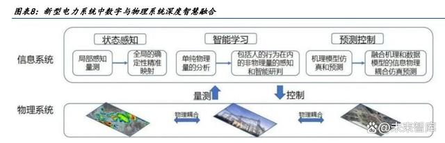 智慧融合是構(gòu)建新型電力系統(tǒng)的基礎(chǔ)。新型電力系統(tǒng)以數(shù)據(jù)為核心驅(qū)動,呈現(xiàn)數(shù)字與物理 系統(tǒng)深度融合特點,系統(tǒng)控制運行由“量測-控制”模式向多物理系統(tǒng)的狀態(tài)感知、智能 學(xué)習(xí)和預(yù)測控制等方式轉(zhuǎn)變。1)狀態(tài)感知:電網(wǎng)內(nèi)外參與耦合運行的物理系統(tǒng),將從局 部的感知量測,向全局的確定性精準映射轉(zhuǎn)變。2)智能學(xué)習(xí):由于參與要素的多樣性,將 從單純物理量的分析,向包括人的行為在內(nèi)的非物理量的感知和智能研判進行轉(zhuǎn)變。3) 預(yù)測控制:將從電力物理系統(tǒng)的機理模型仿真和預(yù)測,向融合機理和數(shù)據(jù)模型的信息物理 耦合仿真預(yù)測轉(zhuǎn)變,提升隨機變量的預(yù)測精度,并應(yīng)用于電網(wǎng)逐級調(diào)控和控制引導(dǎo)。