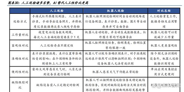 人工巡檢諸多劣勢,AI 替代是大勢所趨。電力行業(yè)有大量巡檢工作條件惡劣,傳統(tǒng)人工 巡檢的工作難度大、危險指數(shù)高、及時性低、工作量大;采用智能巡檢,既具有人工巡檢 的靈活性和智能性,同時響應(yīng)更加及時、效率更高、成本更低,隨著技術(shù)的發(fā)展,智能機 器人技術(shù)具有廣闊的應(yīng)用前景,未來電氣行業(yè)無人化巡檢將成為行業(yè)常態(tài)。 AI 替代人工性價比更高。以 500kv 變電站為例,人工巡檢模式下需要 4 個工人耗費一個 禮拜的工時才能進行一次全面檢查,假設(shè)每位工人年薪約 8 萬,而同樣的工作量,一臺巡 檢機器人能在更短的時間內(nèi)完成,其平均成本為 65 萬/臺,計提折舊后約 16 萬/年,使 用巡檢機器人比人工巡檢能節(jié)約 16 萬/年。