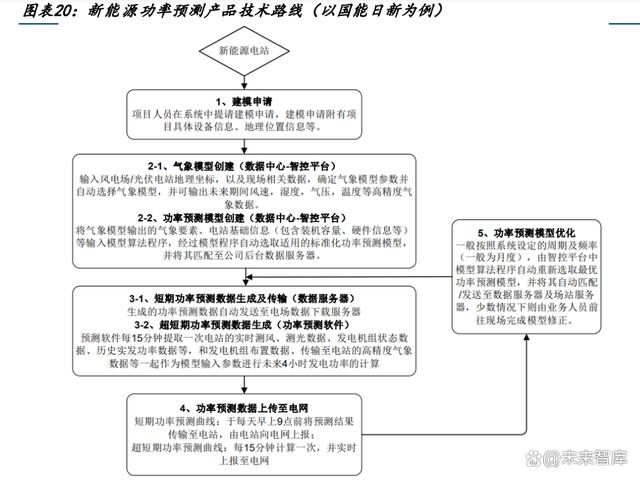 功率預(yù)測技術(shù)路線主要包含數(shù)據(jù)計算、傳輸及模型優(yōu)化。以國能日新為例,公司基本實現(xiàn) 功率預(yù)測算法模型的自動匹配及預(yù)測數(shù)據(jù)的自動計算發(fā)送,因此在項目日常營運端,人力 投入較少,僅在少數(shù)場站模型遠程匹配失敗的情況下,由業(yè)務(wù)人員前往現(xiàn)場完成模型修正。 在模型優(yōu)化方面,一般會按照設(shè)定的周期,由智控平臺中的模型算法程序自動重新選取最 優(yōu)功率預(yù)測模型,并將其自動匹配至站場服務(wù)器。