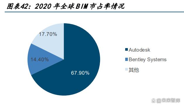 信創(chuàng)發(fā)展背景下,BIM 行業(yè)國(guó)產(chǎn)化替代需求強(qiáng)烈。信息技術(shù)應(yīng)用創(chuàng)新為近年以來(lái)我國(guó)關(guān)鍵 命題,旨在通過(guò)對(duì) IT 硬件、軟件的重構(gòu),建立我國(guó)自主可控的 IT 產(chǎn)業(yè)標(biāo)準(zhǔn)和生態(tài),逐步 實(shí)現(xiàn)各環(huán)節(jié)國(guó)產(chǎn)替代。國(guó)內(nèi)使用的 BIM 平臺(tái)主要為國(guó)外軟件,而國(guó)內(nèi)廠商主要以項(xiàng)目管理 和單點(diǎn)應(yīng)用類型的產(chǎn)品為主,底層核心技術(shù)大多掌握在國(guó)外廠商手中。2020 年全球 BIM 行業(yè)市場(chǎng)中,Autodesk 市占率為 67.9%,其次 Bentley Systems 市占率為 14.37%,CR2 集中度較高,顯示出國(guó)產(chǎn)替代的必要性和緊迫性。