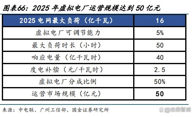 預(yù)計(jì) 2025 年虛擬電廠投資規(guī)模達(dá)到 800 億元,運(yùn)營(yíng)市場(chǎng)規(guī)模達(dá)到 50 億元?,F(xiàn)階段主要 的盈利模式為通過(guò)需求側(cè)響應(yīng)賺取輔助服務(wù)費(fèi)用后的分成。據(jù)中電聯(lián)預(yù)計(jì),2025 年我國(guó) 全社會(huì)用電量將達(dá) 9.5 萬(wàn)億千瓦時(shí),而最大負(fù)荷將達(dá)到 16 億千瓦,按 5%可調(diào)節(jié)能力、投 資成本 1000 元/千瓦計(jì)算,預(yù)計(jì)到 2025 年,虛擬電廠投資規(guī)模有望達(dá) 800 億元。參考目 前峰值負(fù)荷時(shí)長(zhǎng)水平,我們預(yù)計(jì) 2025 峰值負(fù)荷將達(dá)到 50 小時(shí),對(duì)應(yīng) 2025 年電網(wǎng)需求側(cè) 響應(yīng)電量 40 億千瓦時(shí)。目前我國(guó)虛擬電廠處于發(fā)展初期,度電補(bǔ)償較高以刺激時(shí)長(zhǎng),參 考《廣州市虛擬電廠實(shí)施細(xì)則》0-5 元/千瓦時(shí)的削峰響應(yīng)補(bǔ)貼,預(yù)計(jì) 2025 年虛擬電廠進(jìn) 入商業(yè)化運(yùn)營(yíng)后,補(bǔ)償標(biāo)準(zhǔn)為 2.5 元/千瓦時(shí)。假設(shè)分成比例為 50%,則預(yù)計(jì) 2025 年虛擬 電廠運(yùn)營(yíng)市場(chǎng)規(guī)模將達(dá)到 50 億元。