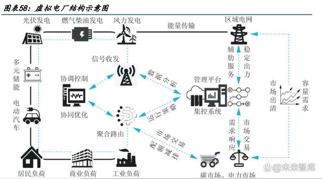 虛擬電廠本質(zhì)上是一套軟件平臺(tái)系統(tǒng),核心為“通信”和“聚合”。通過(guò)先進(jìn)信息通信技 術(shù)和軟件系統(tǒng),實(shí)現(xiàn)分布式電源、儲(chǔ)能系統(tǒng)、可控負(fù)荷、電動(dòng)汽車等分布式能源資源的聚 合和協(xié)調(diào)優(yōu)化,以作為一個(gè)特殊電廠參與電力市場(chǎng)和電網(wǎng)運(yùn)行的電源協(xié)調(diào)管理系統(tǒng),為配 電網(wǎng)和輸電網(wǎng)提供管理和輔助服務(wù)。虛擬電廠概念的核心可以總結(jié)為“通信”和“聚合”, 關(guān)鍵技術(shù)主要包括協(xié)調(diào)控制技術(shù)、智能計(jì)量技術(shù)以及信息通信技術(shù)。 虛擬電廠分為兩類:“負(fù)荷類”虛擬電廠,和“源網(wǎng)荷儲(chǔ)一體化”虛擬電廠。1)“負(fù)荷類” : 聚合了具備調(diào)節(jié)能力的電動(dòng)汽車、充電樁等市場(chǎng)化用戶,作為一個(gè)整體,對(duì)外提供負(fù)荷側(cè) 靈活性相應(yīng)調(diào)節(jié)服務(wù)。2)“源網(wǎng)荷儲(chǔ)一體化”:聚合新能源發(fā)電、用戶及配儲(chǔ)一系列環(huán)節(jié), 作為獨(dú)立市場(chǎng)主體參與電力市場(chǎng)、具備自主調(diào)峰調(diào)節(jié)能力。 具備“源-荷”雙重身份,有效實(shí)現(xiàn)削峰填谷。虛擬電廠把各類可調(diào)負(fù)荷資源匯聚,根據(jù) 電網(wǎng)削峰填谷的需求,進(jìn)行線上填報(bào),計(jì)劃下發(fā),執(zhí)行反饋,類似于線上工單派單系統(tǒng)。 電網(wǎng)給調(diào)度指令計(jì)劃,需求響應(yīng)調(diào)控計(jì)劃,提前幾天/幾周把計(jì)劃發(fā)下來(lái)。負(fù)荷集成商, 虛擬電廠運(yùn)營(yíng)商,會(huì)把計(jì)劃告訴客戶,哪些時(shí)段把負(fù)荷停掉,把用電負(fù)荷降下來(lái),具有源 -荷雙重身份。