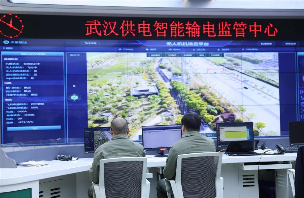 10月23日,武漢漢口江灘,一架白色的無人機在高空穿梭,機頭對準濱江區(qū)內的國家電網線路來回進行掃描、拍攝。與此同時,距離巡檢現(xiàn)場數公里外的國網武漢供電公司的巨型屏幕上,無人機的超高清畫面即時顯示。