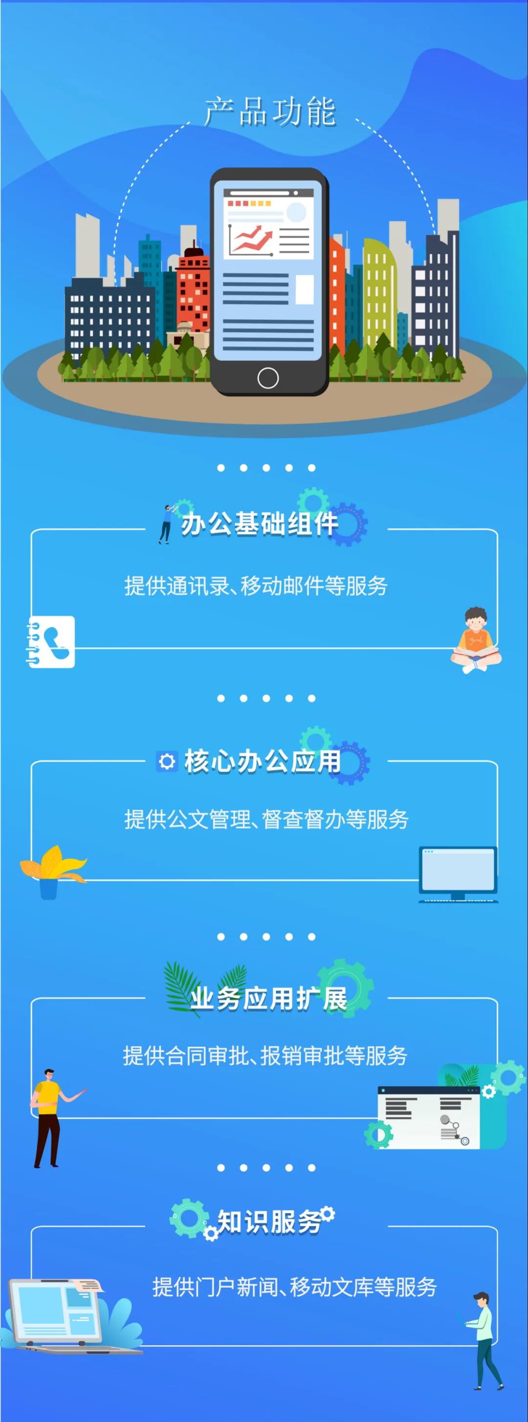 在公文、督辦、會(huì)議等核心辦公應(yīng)用功能的基礎(chǔ)上,實(shí)現(xiàn)了即時(shí)通訊、移動(dòng)郵件、文檔協(xié)作、視頻會(huì)議、知識(shí)服務(wù)等基礎(chǔ)辦公服務(wù),為用戶提供豐富的移動(dòng)業(yè)務(wù)應(yīng)用功能。