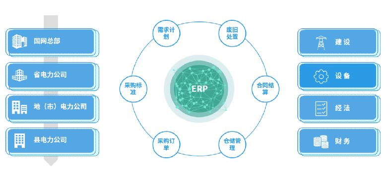 企業(yè)資源管理系統(tǒng)ERP(Enterprise Resource Planning,簡稱ERP)著力實現(xiàn)“資源一盤棋”,通過與ECP、EIP等系統(tǒng)緊密集成,總部、省、市、縣縱向體系貫通,設(shè)備、經(jīng)法、財務(wù)等橫向?qū)I(yè)協(xié)同,實現(xiàn)采購訂單、庫存物資、資金結(jié)算等企業(yè)資源統(tǒng)籌管控。該系統(tǒng)主要由計劃管理、合同管理、倉儲管理和廢舊物資處置管理四個業(yè)務(wù)子模塊組成。