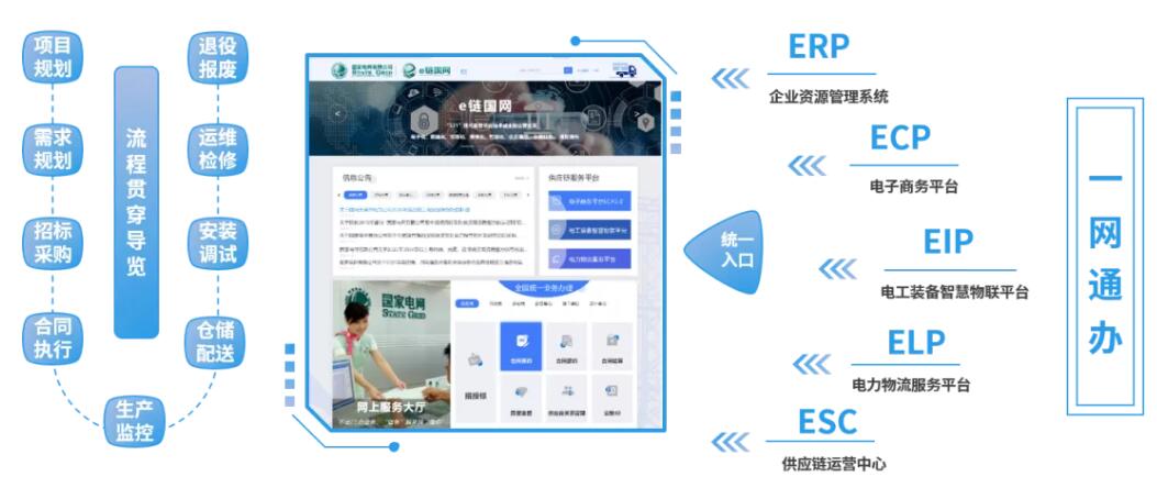 “e鏈國網(wǎng)”一站式服務(wù)門戶構(gòu)建現(xiàn)代智慧供應(yīng)鏈業(yè)務(wù)體系統(tǒng)一的PC前端窗口,以新一代電子商務(wù)平臺ECP2.0、企業(yè)資源系統(tǒng)ERP、電工裝備智慧物聯(lián)平臺EIP、電力物流服務(wù)平臺ELP、供應(yīng)鏈運營中心ESC等核心系統(tǒng)作為底層業(yè)務(wù)支撐,向內(nèi)外部用戶提供供應(yīng)鏈相關(guān)的業(yè)務(wù)流程和信息服務(wù),提升對內(nèi)部用戶、供應(yīng)鏈伙伴的服務(wù)水平。