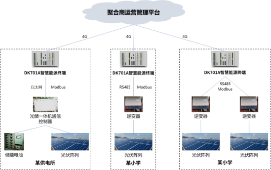 基于DK701智能終端平臺(tái)的優(yōu)勢特性,目前江行智能已成功開發(fā)DK701A智慧能源終端和DK701E儲(chǔ)能EMS就地控制器,并應(yīng)用到虛擬電廠聚合商運(yùn)營管理系統(tǒng)及數(shù)字配電網(wǎng)臺(tái)區(qū)儲(chǔ)能等項(xiàng)目建設(shè),在光伏、儲(chǔ)能、充電樁等具體場景發(fā)揮了重要作用。以國網(wǎng)寧夏某公司打造的聚合商運(yùn)營管理系統(tǒng)為例,通過在供電所、小學(xué)配置智慧能源終端,可將自身所擁有的分布式光伏、分布式儲(chǔ)能、電采暖等可調(diào)節(jié)資源數(shù)據(jù)接入省級(jí)虛擬電廠運(yùn)營管理平臺(tái),實(shí)現(xiàn)對(duì)可調(diào)節(jié)資源的可觀、可測、可調(diào)、可控。