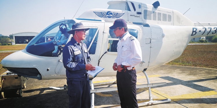 廣東電網(wǎng)公司佛山供電局輸電所智能運(yùn)維人員利用直升機(jī)吊艙開(kāi)展架空線(xiàn)路激光建模。 麥俊佳 攝