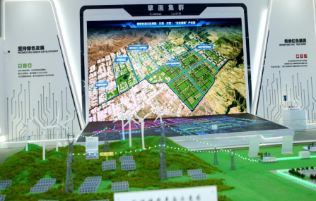 在展示區(qū)中心位置擺放的東數(shù)西算產(chǎn)業(yè)園區(qū)模擬沙盤上,一個(gè)個(gè)風(fēng)力發(fā)電機(jī)和光伏發(fā)電基地格外吸引眼球,通過一座座銀色電網(wǎng)鐵塔與產(chǎn)業(yè)園區(qū)緊密相連,為園區(qū)產(chǎn)業(yè)發(fā)展提供源源不斷地清潔電力能源。同時(shí),墻上的電子屏幕滾動(dòng)播放著“數(shù)字經(jīng)濟(jì)招商企業(yè)一覽表”,顯示已有53家企業(yè)簽約。