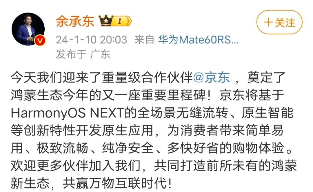 華為常務(wù)董事、終端業(yè)務(wù)CEO、智能汽車解決方案BU董事長余承東在微博發(fā)文稱:“今天我們迎來了重量級(jí)合作伙伴京東,奠定了鴻蒙生態(tài)今年的又一座重要里程碑!